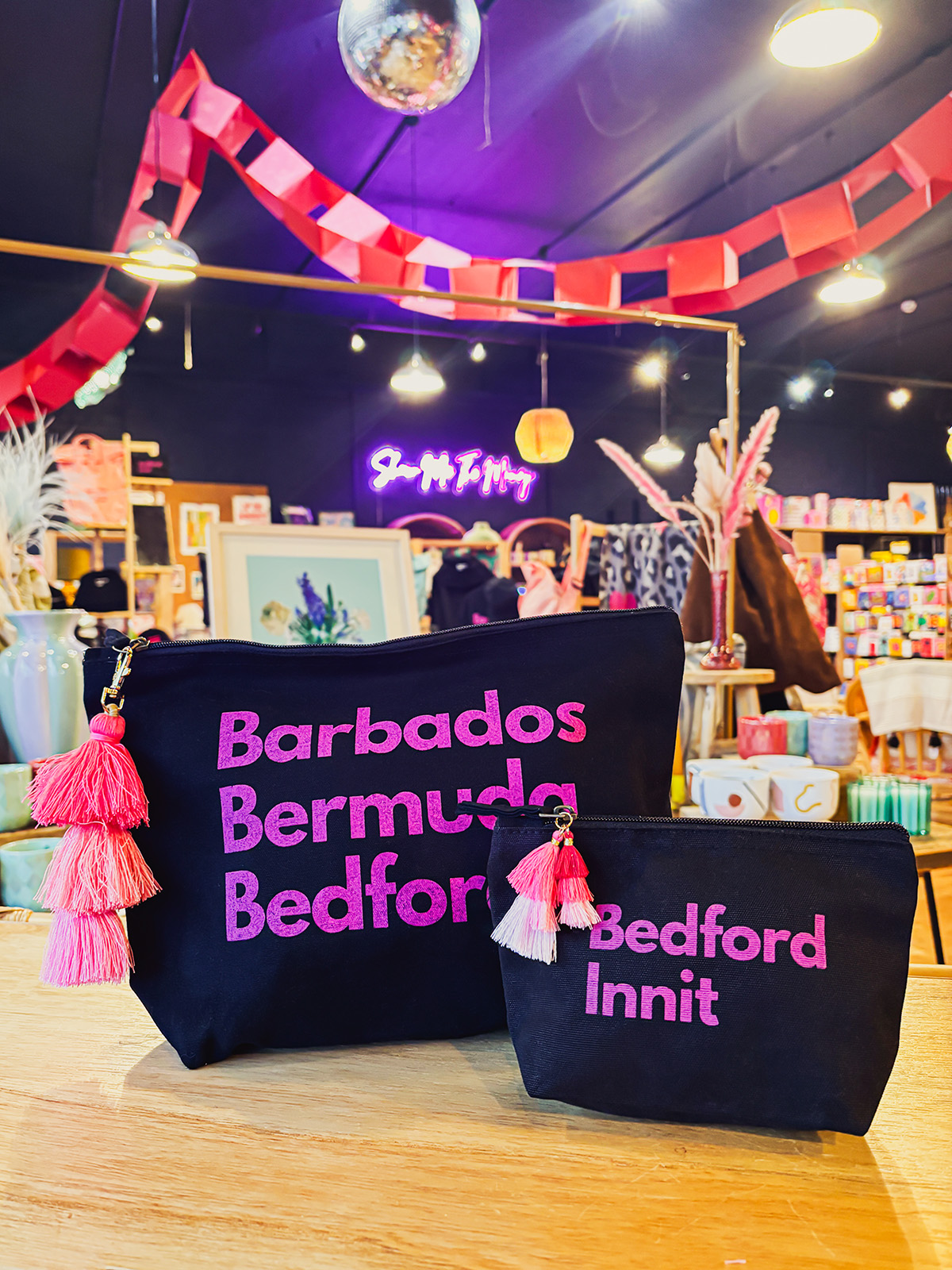 The large pouches come in black, and printed with either Barbados, Bermuda, Bedford or Bedford innit. Each pouch is finished with an oversized hot pink tassel — lovingly attached by The Arc team.