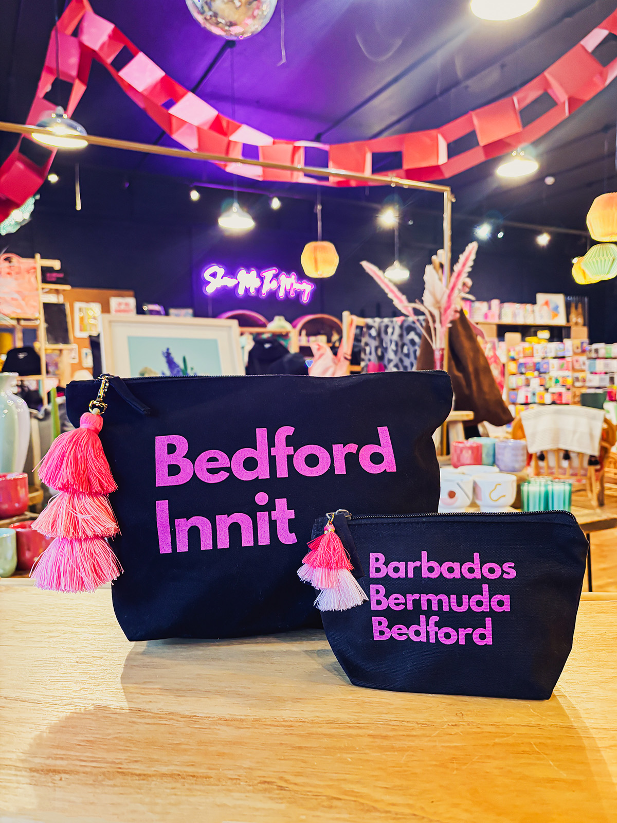 The small pouches come in black or cream/natural, and are printed with either Barbados, Bermuda, Bedford or Bedford Innit. Each pouch is finished with hot pink tassels added by hand, by The Arc team!