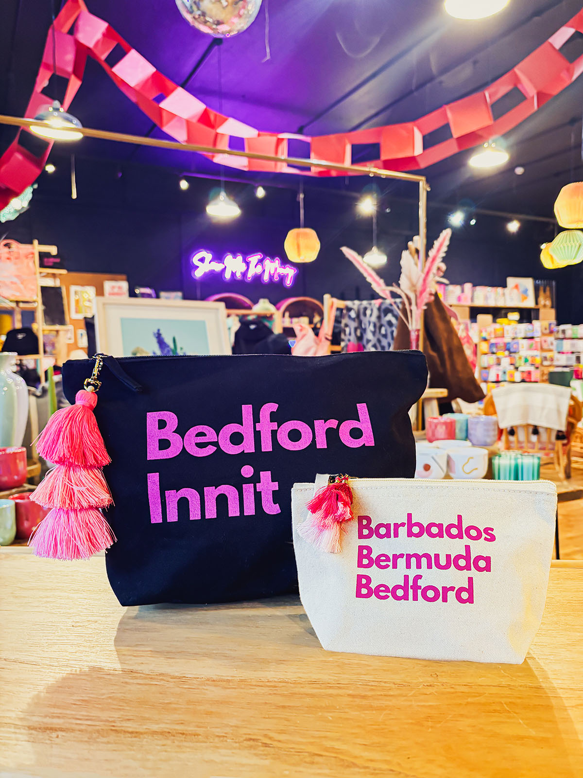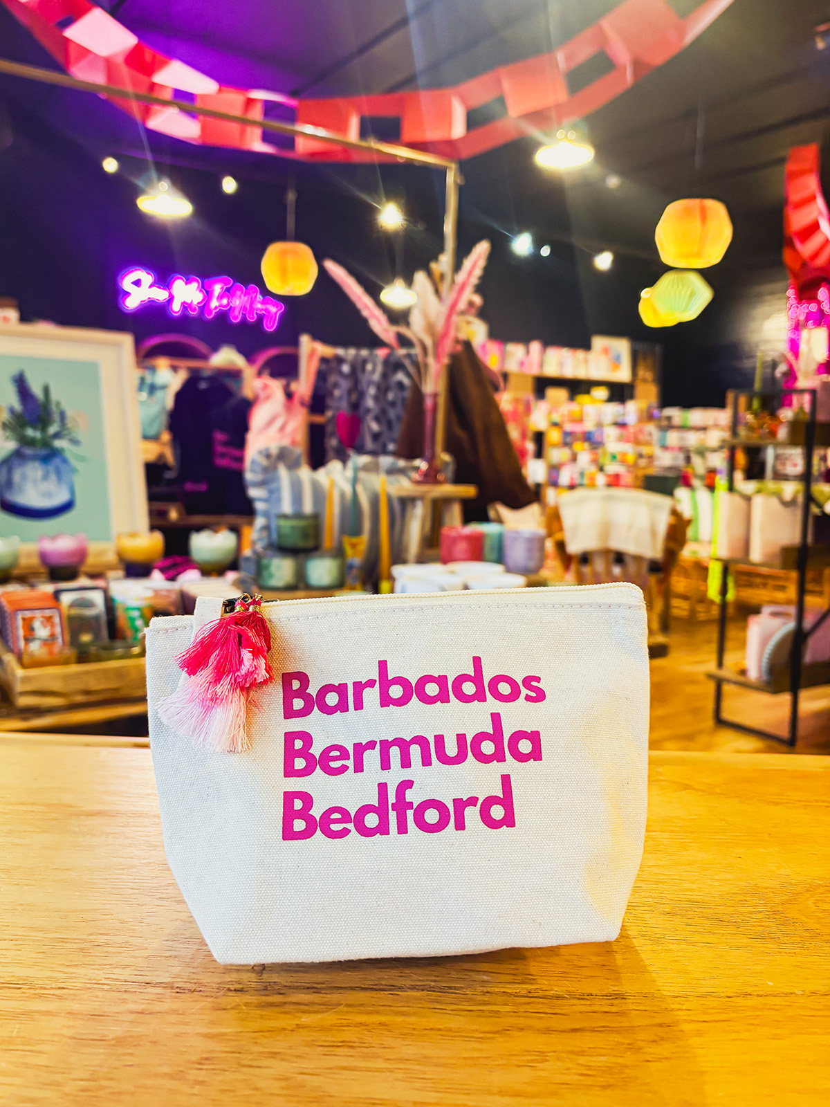 The small pouches come in black or cream/natural, and are printed with either Barbados, Bermuda, Bedford or Bedford Innit. Each pouch is finished with hot pink tassels added by hand, by The Arc team!