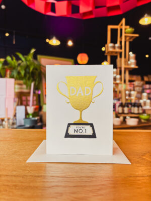 Celebrate your No.1 with this crisp white card featuring an embossed gold foil trophy cup, proudly engraved with “Dad. You’re No 1”. Simple, shiny, and full of champion energy — just like him.